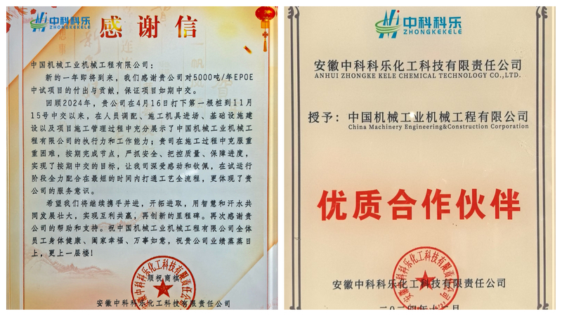 近日,安徽中科科樂化工科技有限責(zé)任公司對雙方合作的山東東明5000噸/年EPOE中試項(xiàng)目高度肯定,公司被授予“優(yōu)質(zhì)合作伙伴”,項(xiàng)目也收獲感謝信,對項(xiàng)目團(tuán)隊(duì)的付出與貢獻(xiàn),保證項(xiàng)目如期中交表示感謝。信中指出,從4月16日打下第一根樁到11月15號中交以來,在人員調(diào)配、施工機(jī)具進(jìn)場、基礎(chǔ)設(shè)施建設(shè)以及項(xiàng)目施工管理過程中充分展示了公司的執(zhí)行力和工作能力。公司在施工過程中克服重重困難,按期完成節(jié)點(diǎn),嚴(yán)抓安全、把控質(zhì)量、保障進(jìn)度,實(shí)現(xiàn)了按期中交的目標(biāo)。