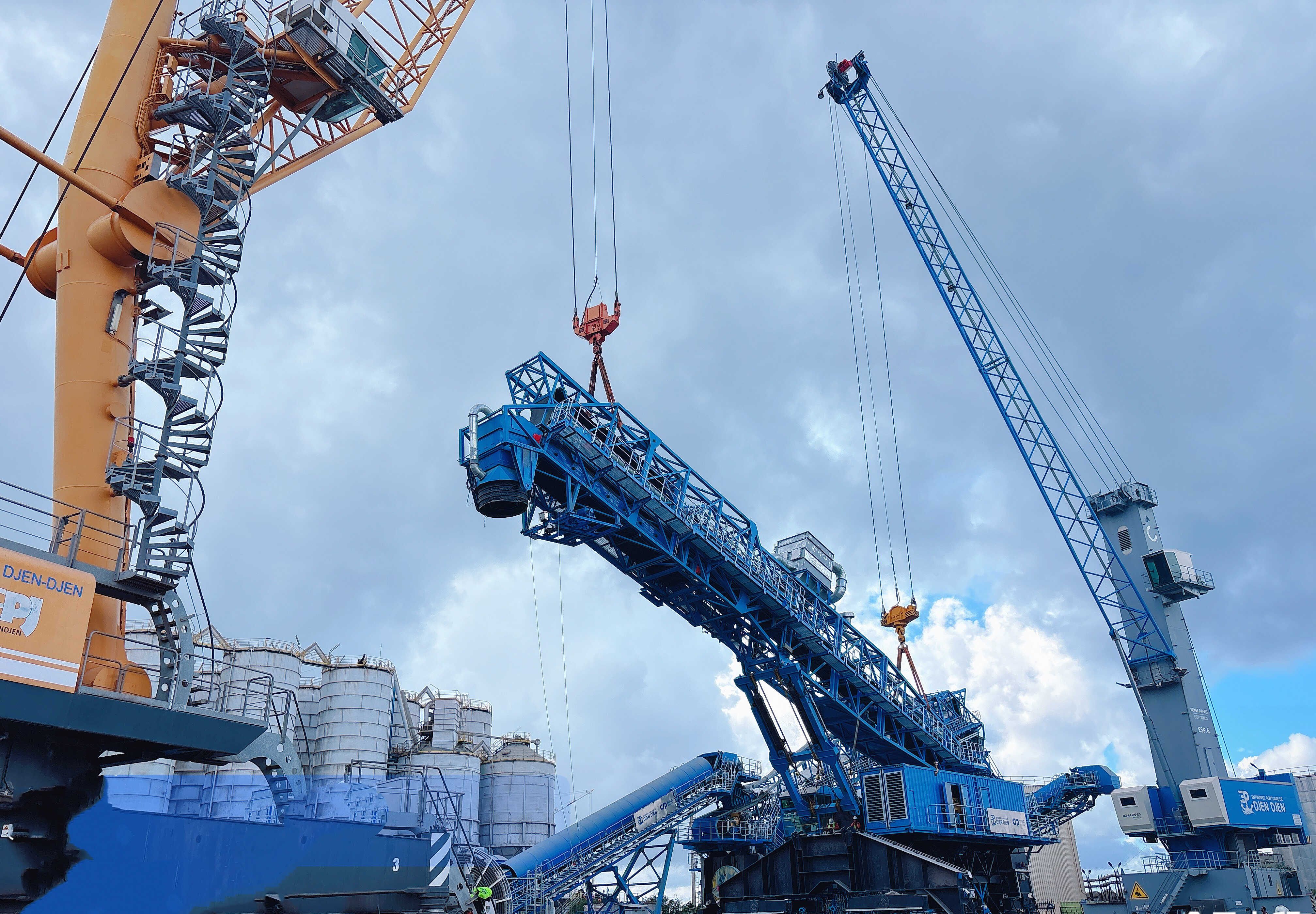 近日,隨著兩臺(tái)吊機(jī)的主臂緩緩吊起第二臺(tái)裝船機(jī)桁架總成定位銷入孔,標(biāo)志著阿爾及利亞裝船機(jī)項(xiàng)目Djendjen港標(biāo)段主體結(jié)構(gòu)順利完工,項(xiàng)目迎來(lái)重大進(jìn)展。