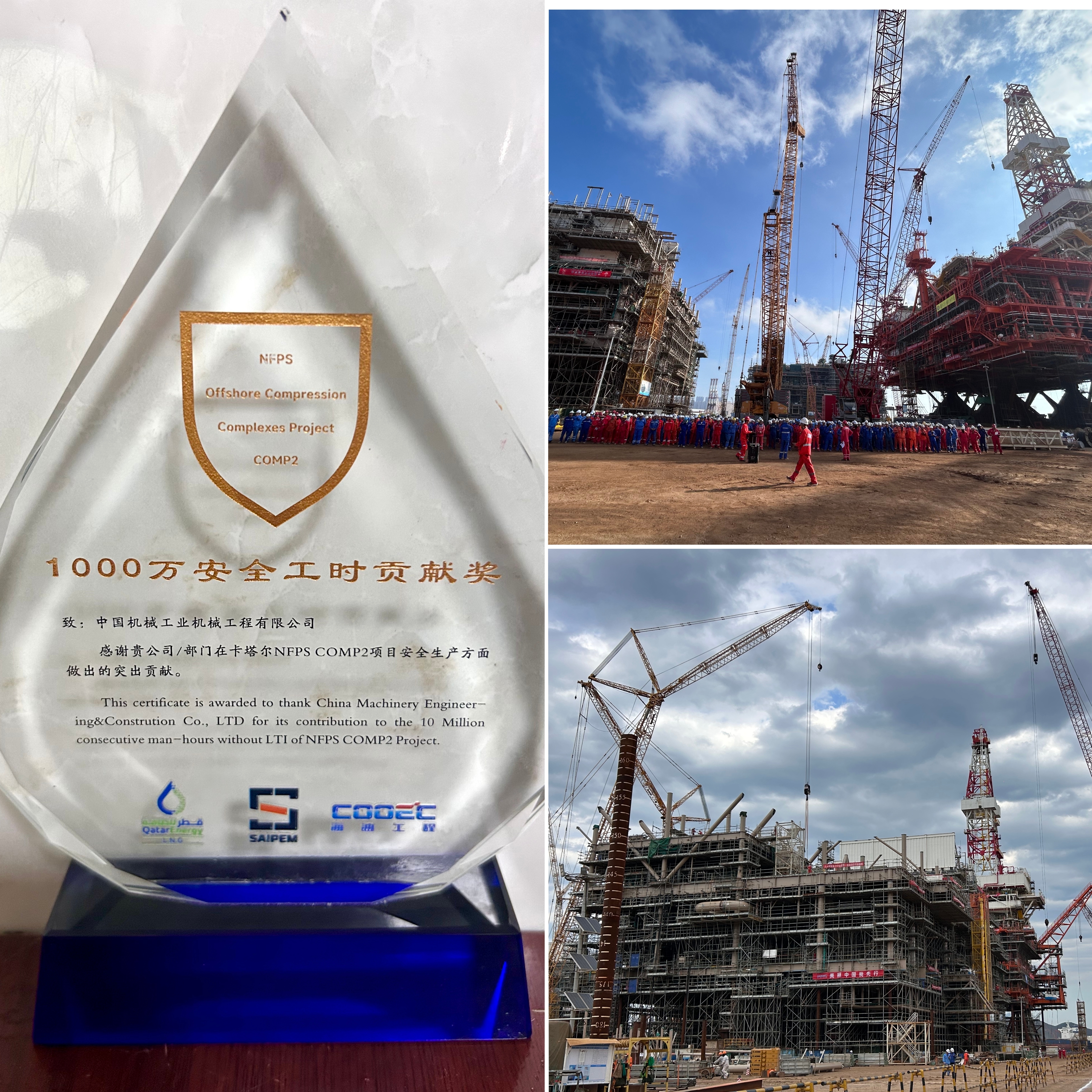 近日,卡塔爾NFPS COMP2項(xiàng)目實(shí)現(xiàn)1000萬(wàn)安全工時(shí),順利達(dá)成安全管理的重要里程碑,公司被授予“卡塔爾NFPS COMP2項(xiàng)目1000萬(wàn)安全工時(shí)貢獻(xiàn)獎(jiǎng)”。